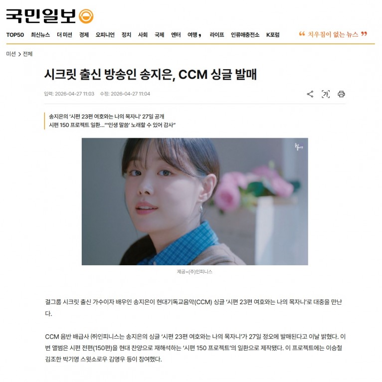 [기사] 시크릿 출신 방송인 송지은, CCM 싱글 발매(국민일보)